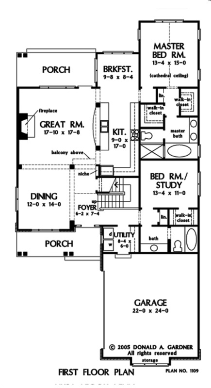 Possessing radiant curb appeal, this design’s stone and siding facade stylishly blends with triple gable peaks, columns and decorative windows to showcase a truly unique exterior. A grand staircase immediately greets guests in the formal foyer, while an adjacent art niche adds flair. The open dining and great rooms permit a natural traffic flow and embrace the homes open layout. The breakfast room overlooks a rear porch. Completing the first level is a spacious master suite and study/bedroom with nearby full bath. Featuring a private privy, dual vanities, separate shower and tub, the master bath’s details fuse functionality with modern living. The upstairs consists of a loft, generous bonus room and secondary bedrooms with a built-in balcony seat.
